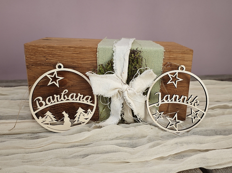 Bringe Individualität an deinen Weihnachtsbaum mit meinen personalisierten, gelaserten Anhängern. Wähle zwischen zwei bezaubernden Designs – Winterlandschaft oder Sterne. Die Anhänger haben einen Durchmesser von 80mm.Gib bitte die gewünschten Namen im Kommentartfeld beim Checkout ein.