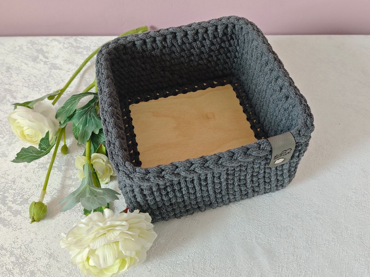 Der Korb wird aus hochwertigem Garn gehäkelt und mit einem passenden Holzboden versehen. So entsteht ein fester Stand und eine moderne, natürliche Optik.