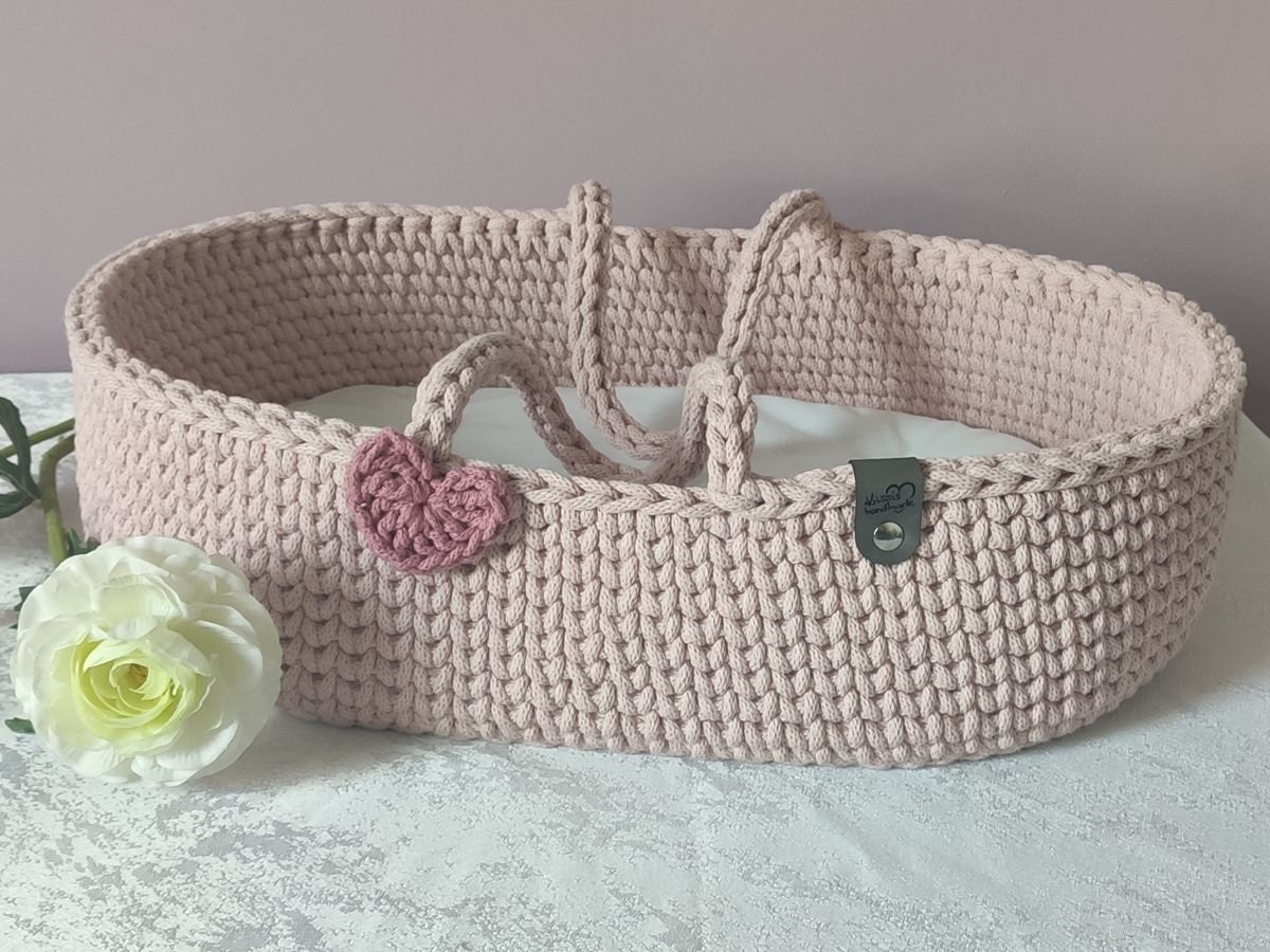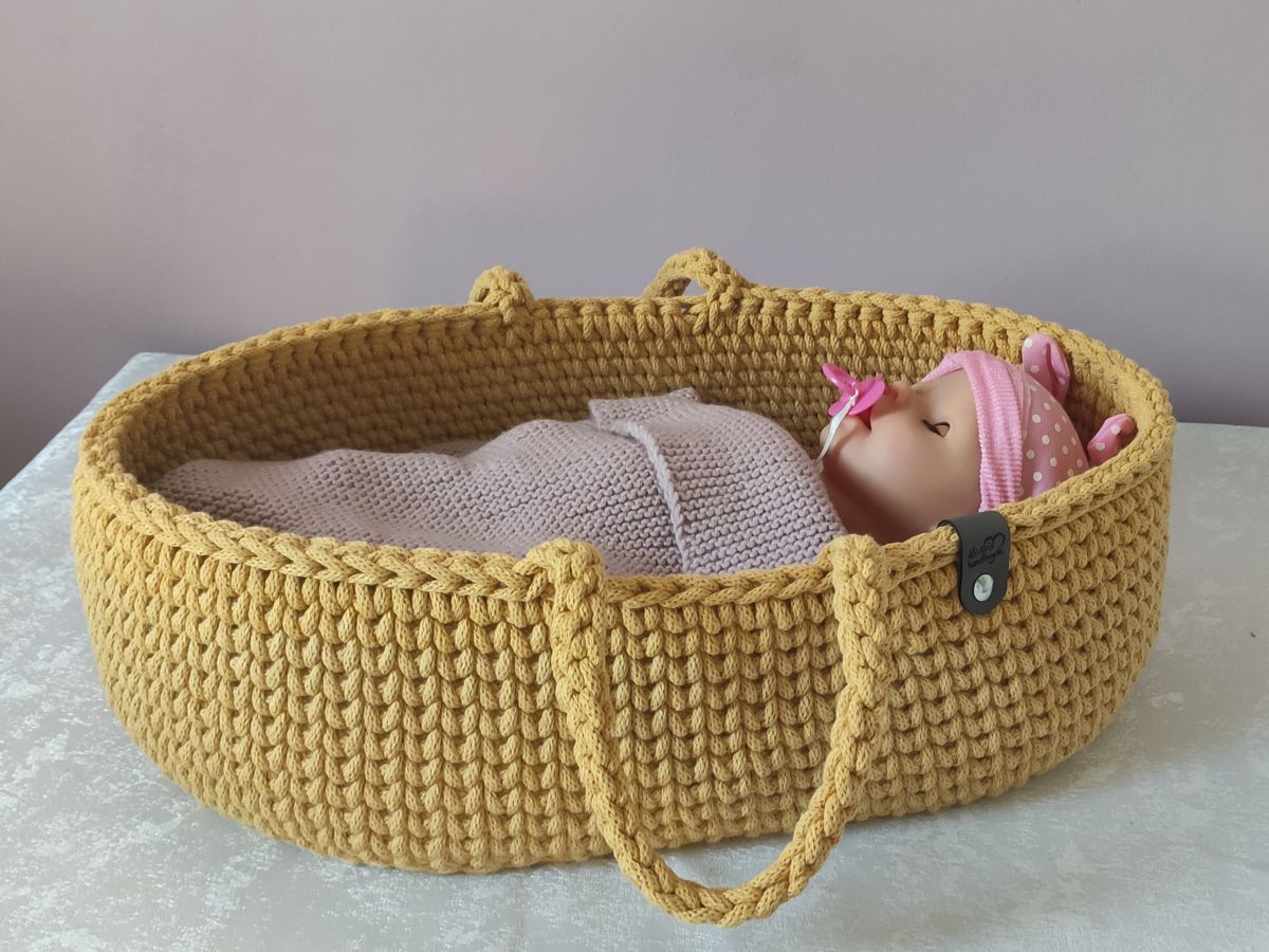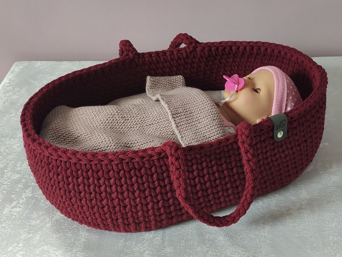 Dieses süße Puppenbett ist aus robuster Bobbiny 5mm Kordel gehäkelt und hat einen stabilen Holzboden.