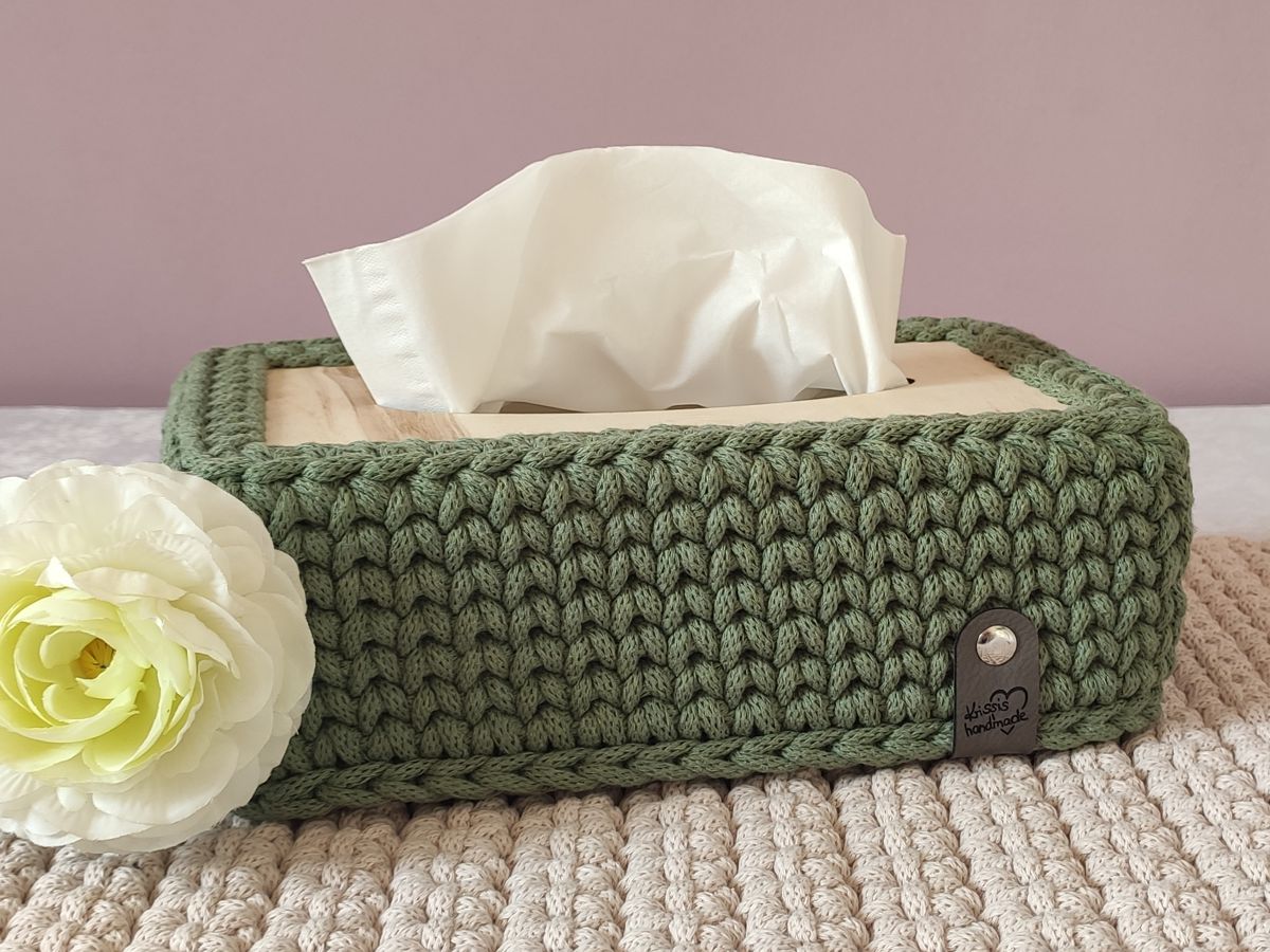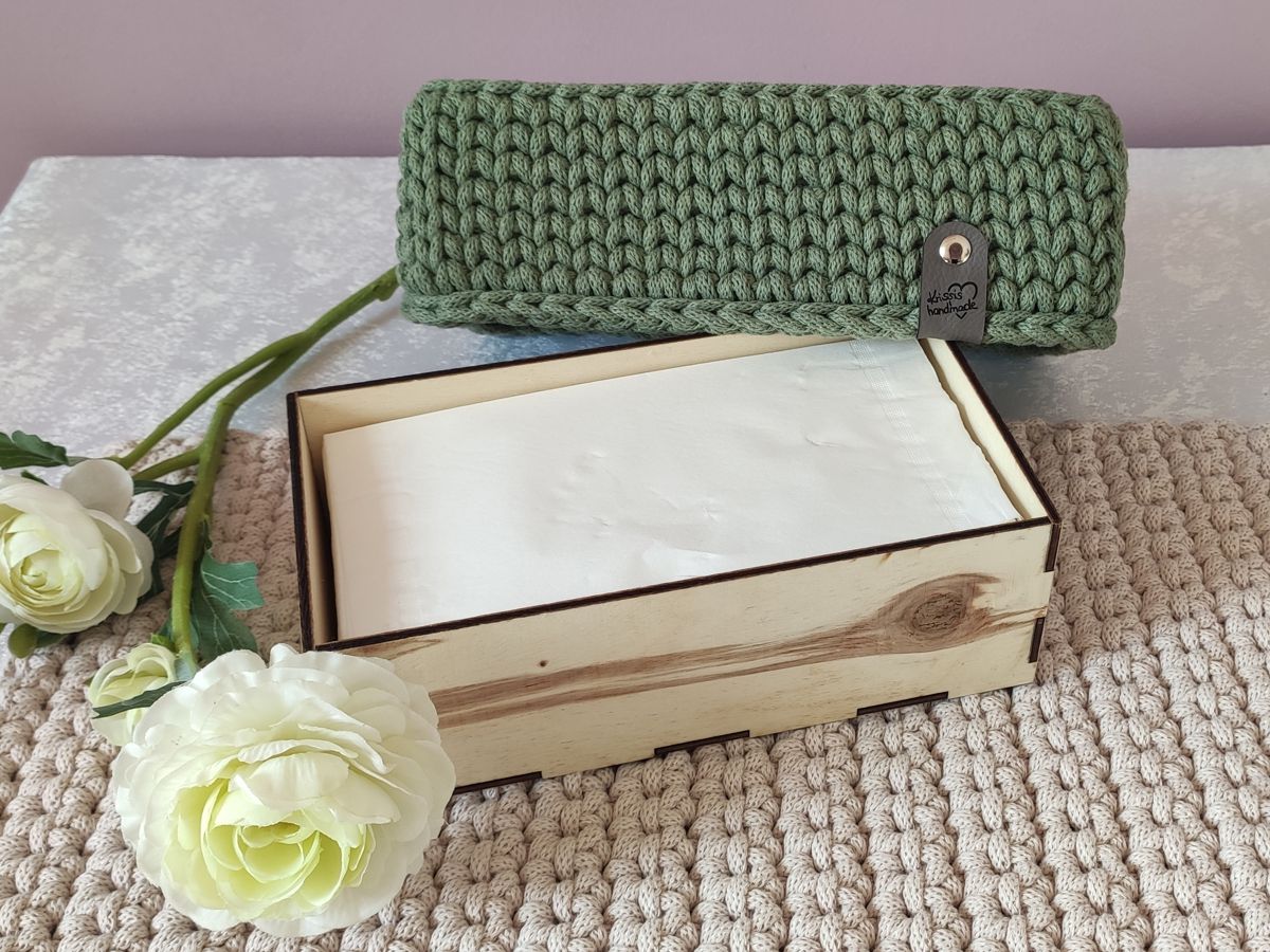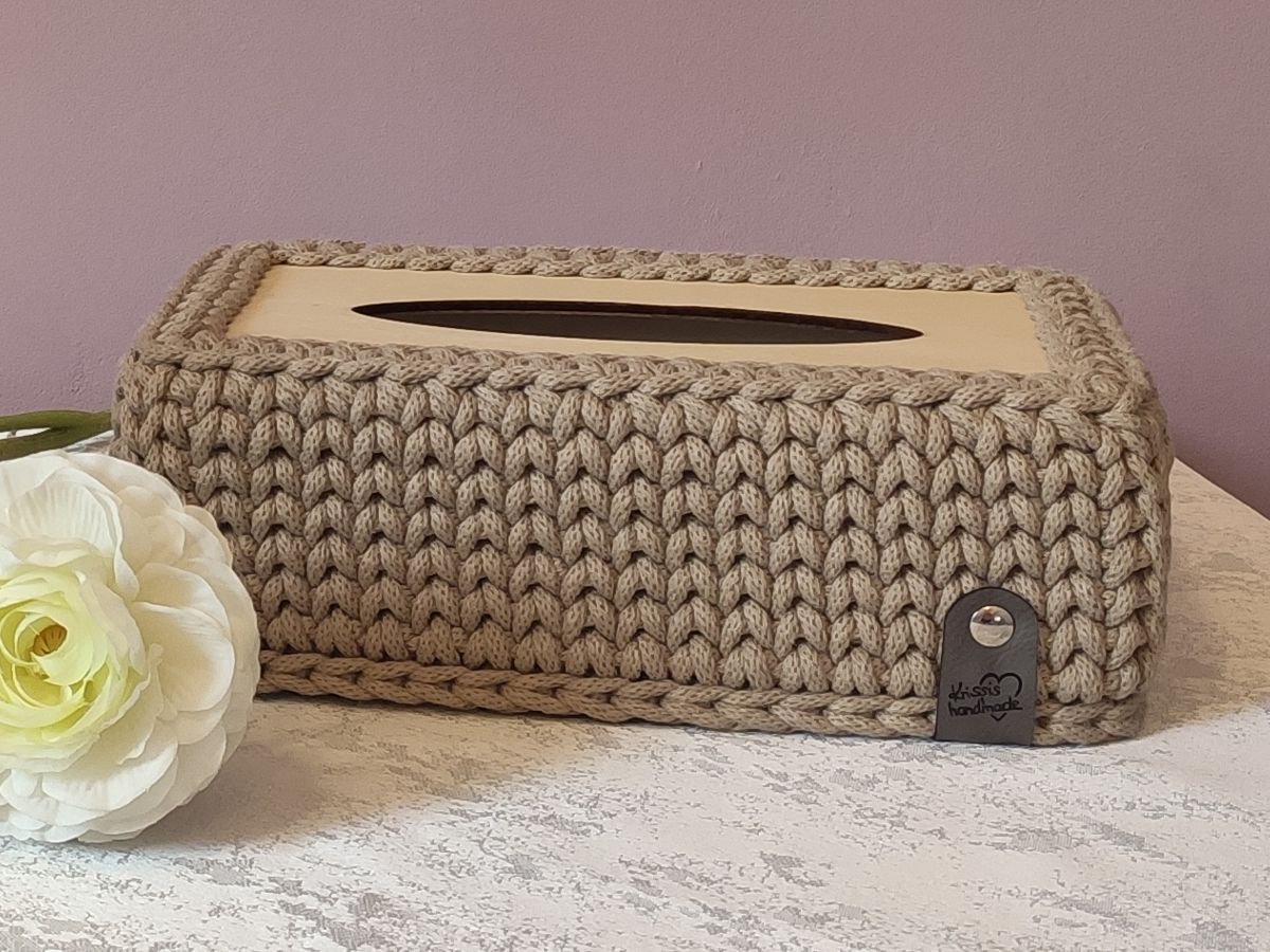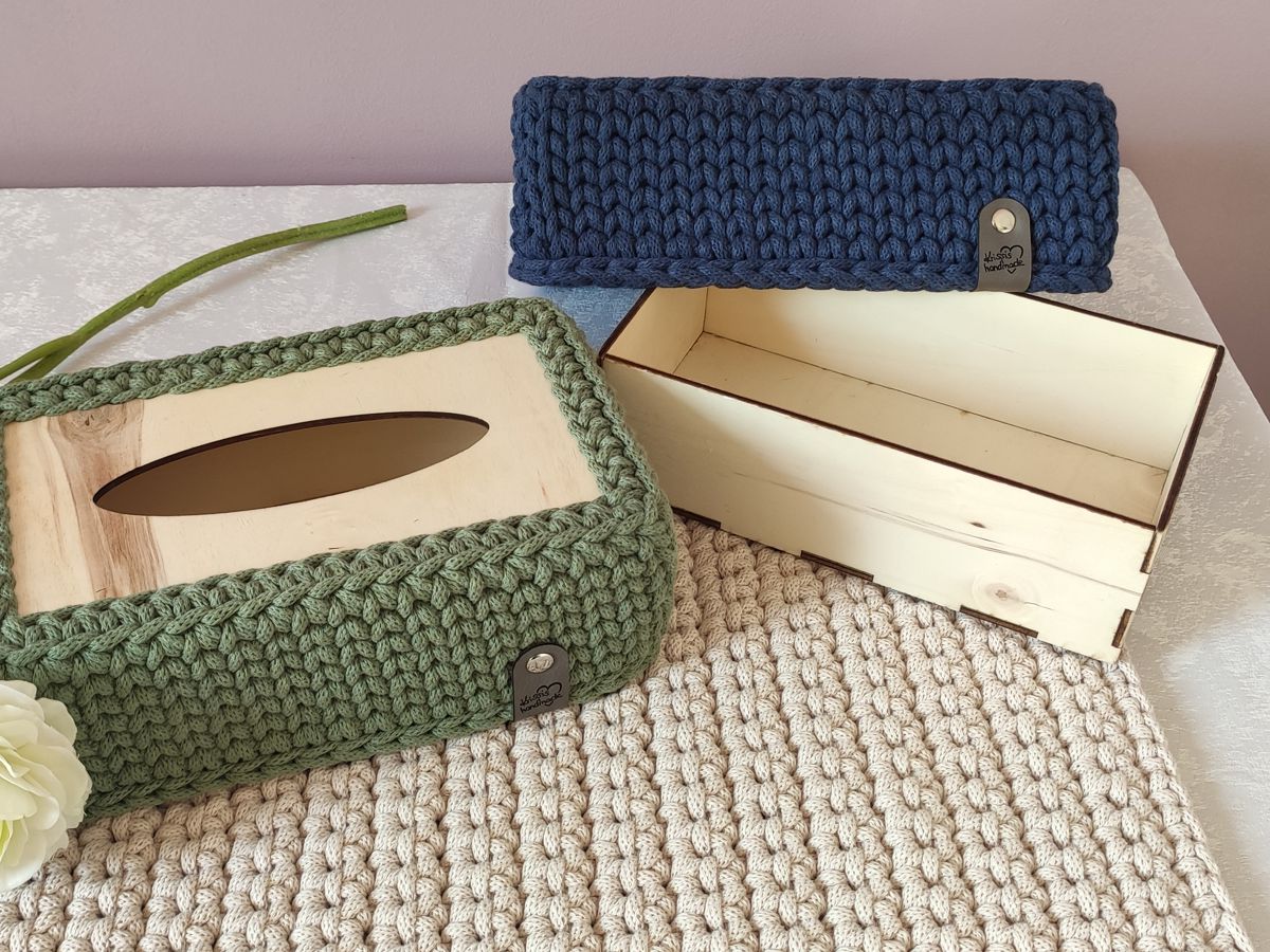 Sie besteht aus einer von mir gefertigten Holzbox und einem gehäkelten Deckel aus weicher, hochwertiger Bobbiny-Kordel – stilvoll, praktisch und angenehm anzufassen.