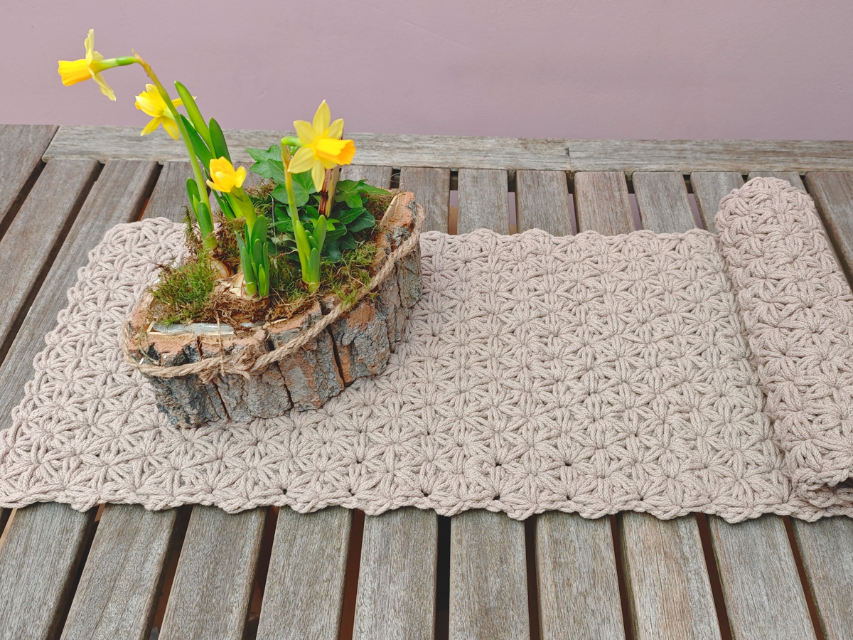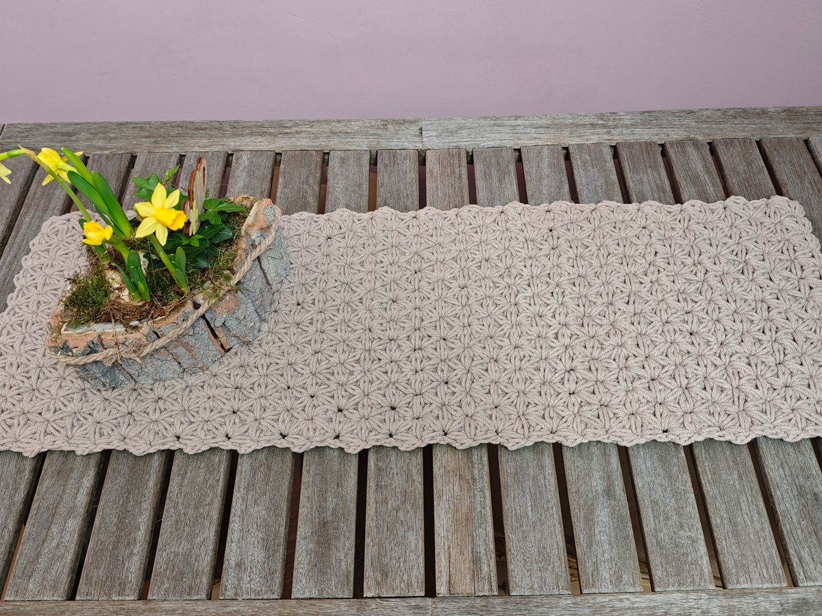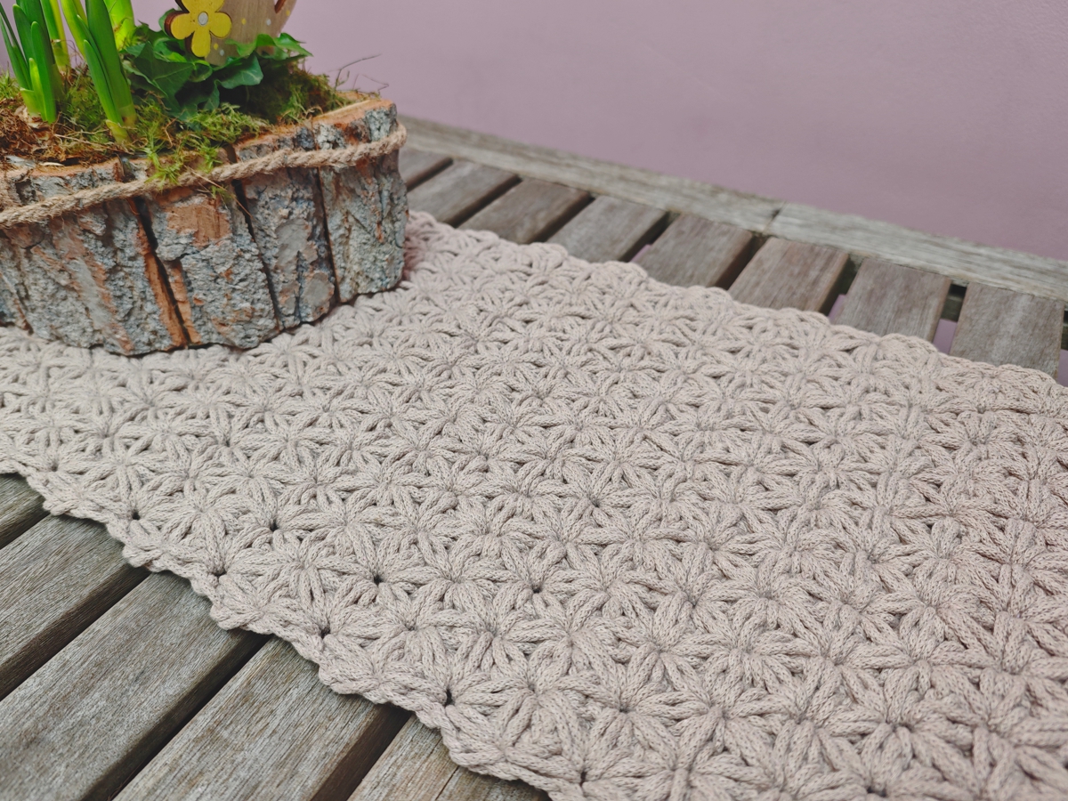 Mit meinem handgefertigten Tischläufer „Jasmin“ bringst du eine stilvolle und besondere Note auf deinen Tisch. Das elegante Muster verleiht dem Läufer eine schöne Struktur und macht ihn zu einem dekorativen Blickfang.